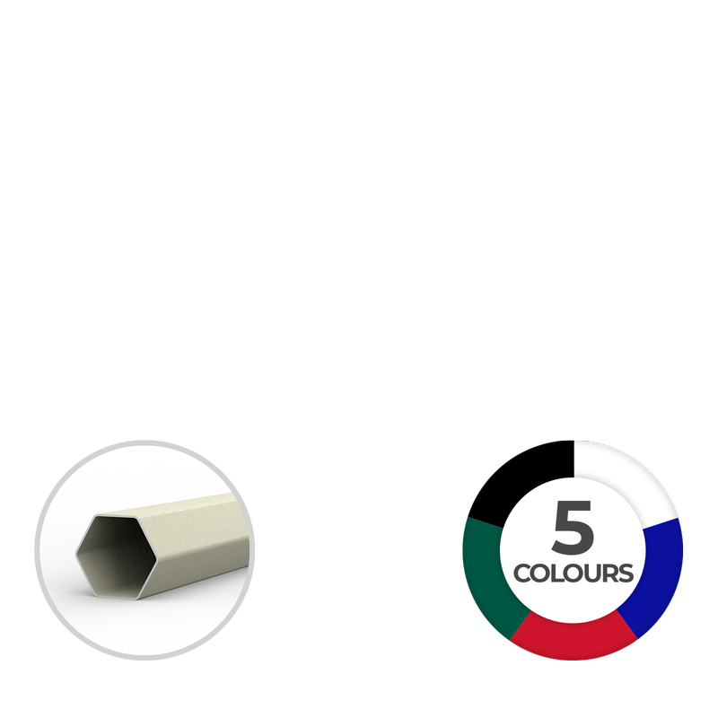 • Pfosten aus hochwertigen, stabilen Sechskantprofilen aus pulverbeschichtetem Stahl, beige mit Hammerschlag-Optik (oben/unten: ø 40 mm/ø 36 mm, Wandstärke 1 mm)